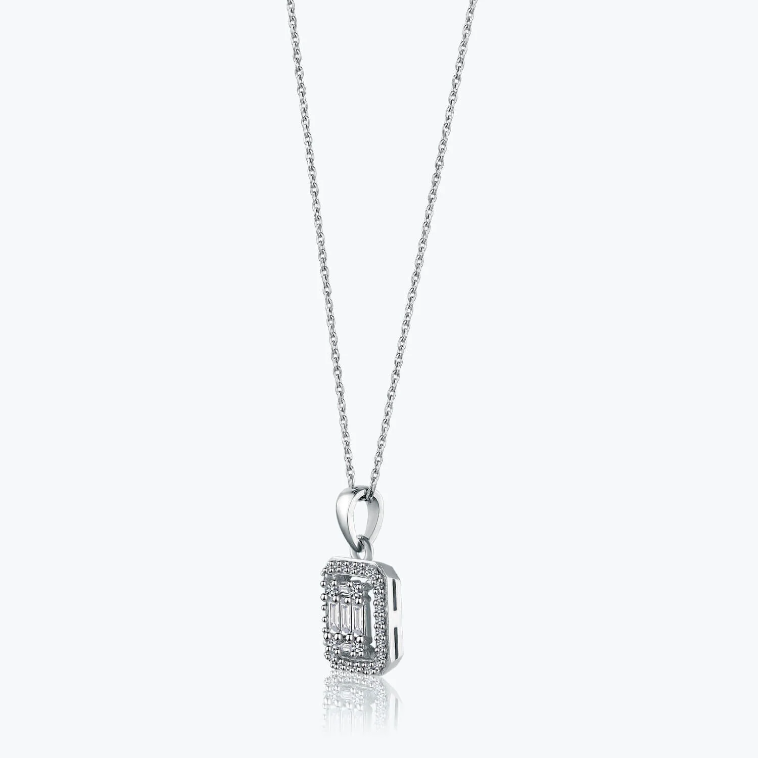The necklace is adorned with meticulously placed cubic zirconia stones, each one reflecting light in a unique way to create a breathtaking sparkle. The baguette design of the necklace is a timeless style, showcasing the harmony of beauty and style in one exquisite piece.